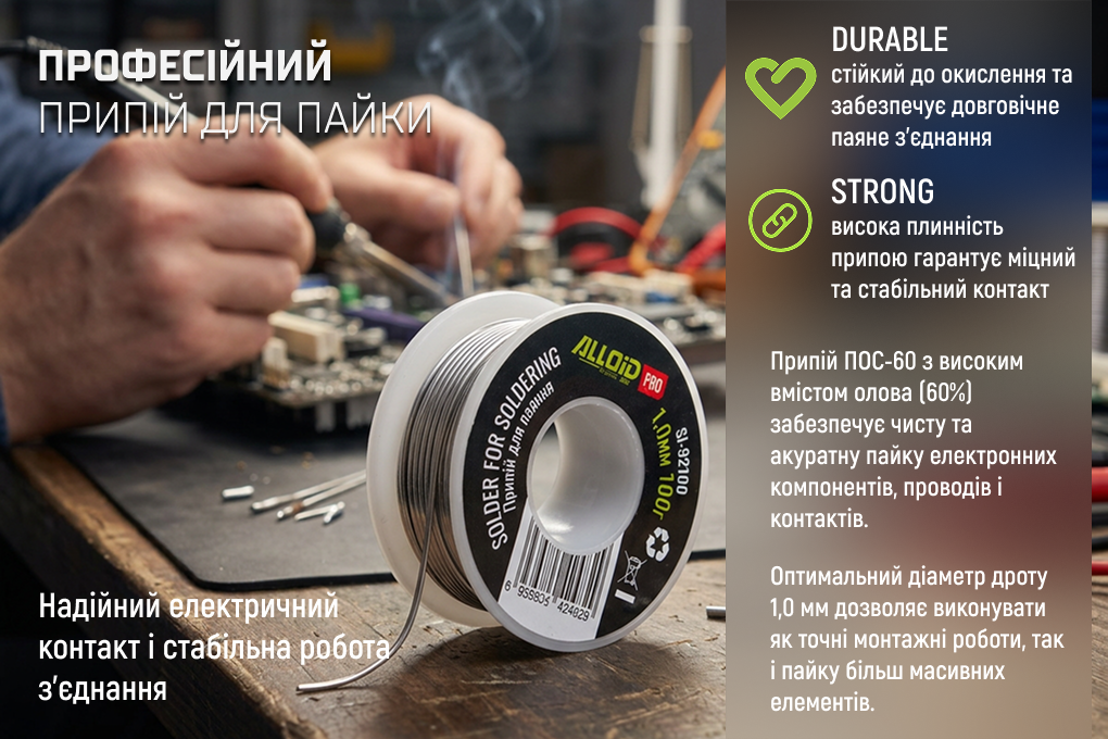 Припій Alloid Pro ПОС-60 — це професійний розхідний матеріал для паяння та лудіння, який поєднує високу якість з&apos,єднання та зручність у роботі.