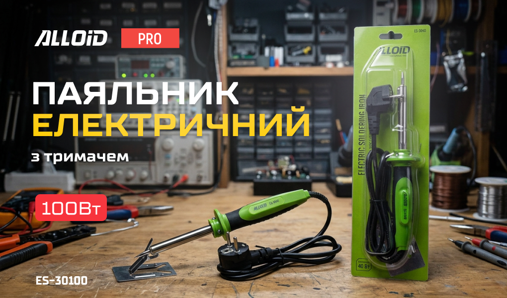 Паяльник электрический Alloid с держателем 100 Вт — мощный и надёжный инструмент для выполнения интенсивных паяльных работ.