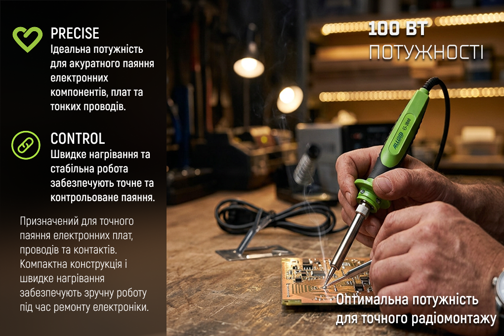 Высокая мощность обеспечивает быстрый нагрев жала и стабильную температуру при пайке массивных проводов, клемм и металлических элементов.