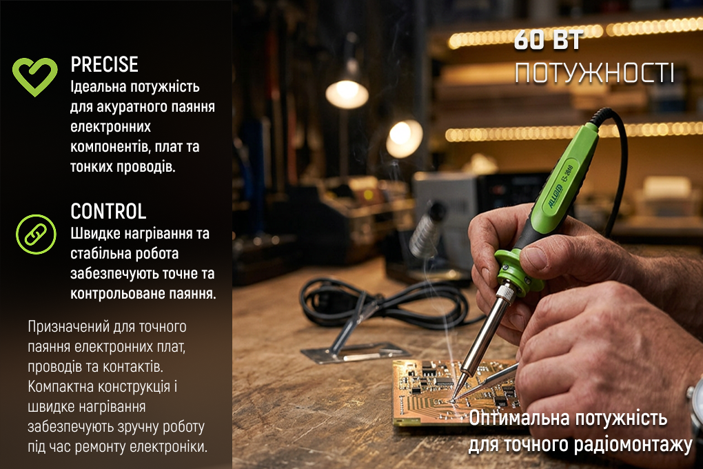 Оптимальная мощность обеспечивает стабильный нагрев жала и комфортную пайку проводов, контактных соединений и электронных компонентов.