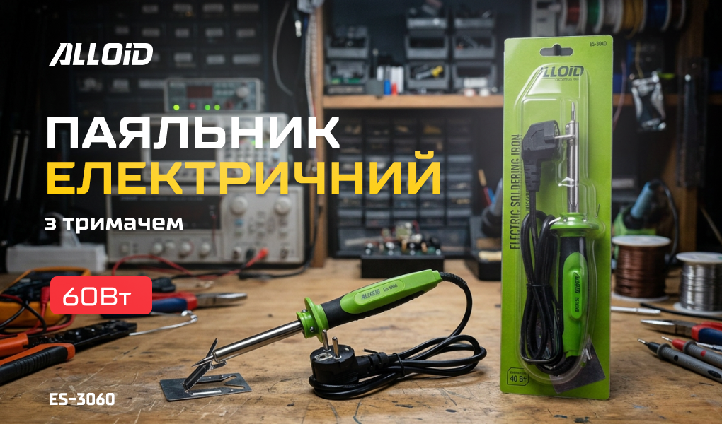 Паяльник электрический Alloid с держателем 60 Вт — универсальный инструмент для выполнения бытовых и полупрофессиональных паяльных работ.